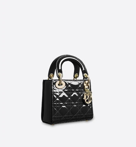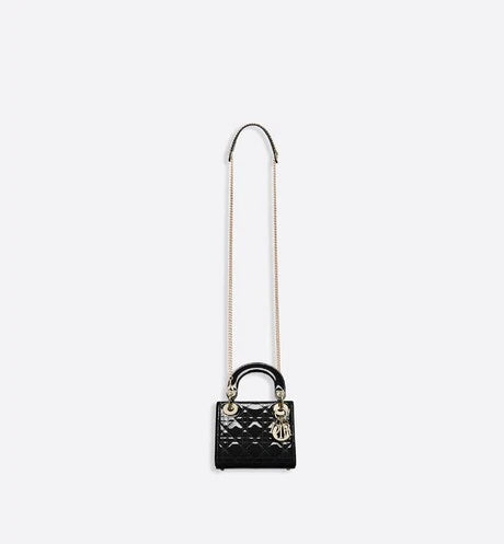 "カナージュ "ステッチがあしらわれたブラック エナメルカーフレザーの " Lady (レディ ディオール)" チェーンミニバッグに、ペールゴールドメタルの アクセサリーが際立ちます。ロングチェーン付きです。