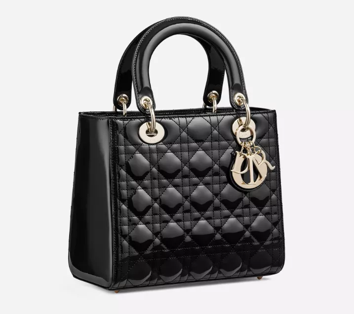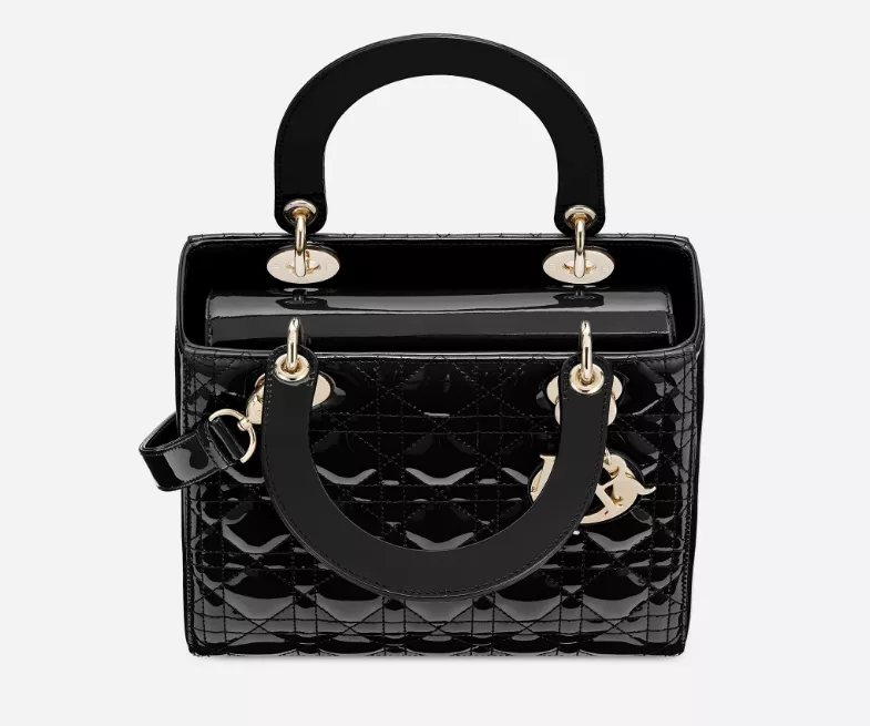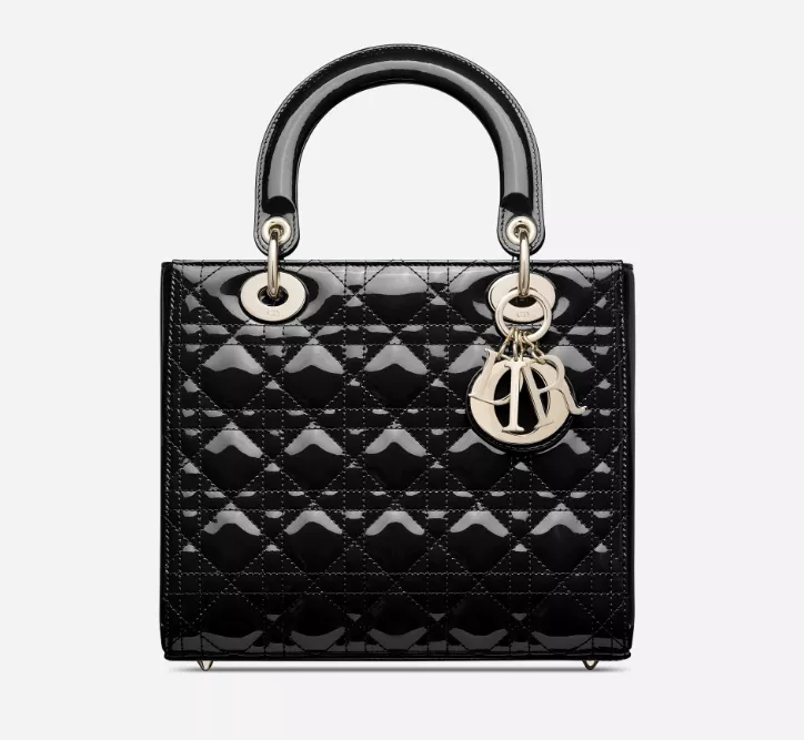 カナージュステッチがあしらわれたブラック パテントカーフスキンの“Lady Dior” バッグ、長さ調節可能なストラップ付き。